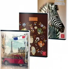 Dimensiuni: 145 x 205 mm. Interior 48 file, hartie de 55 gr/mp, liniatura in culoare gri, fara margini. Coperta din carton 200 g/mp, printata 4+0. Diverse modele...